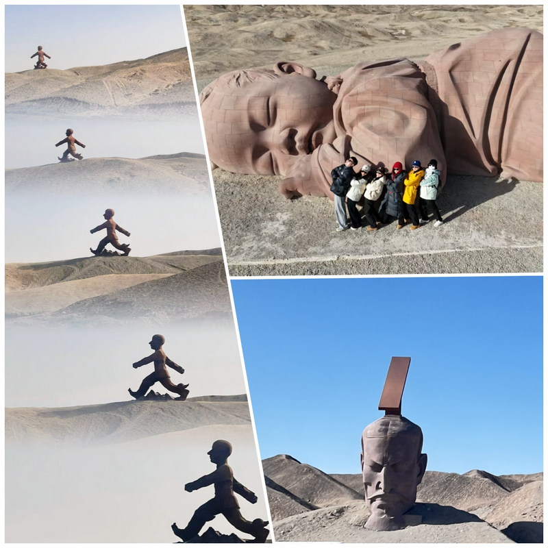 告別嘉峪關(guān)前往敦煌,途經(jīng)瓜州縣,游覽了瓜州的大地之子、漢武帝、海市蜃樓雕塑群。這些雕塑作品以其獨特的藝術(shù)魅力和深刻的主題內涵,引發(fā)了大家對自然與人類(lèi)關(guān)系的思考。