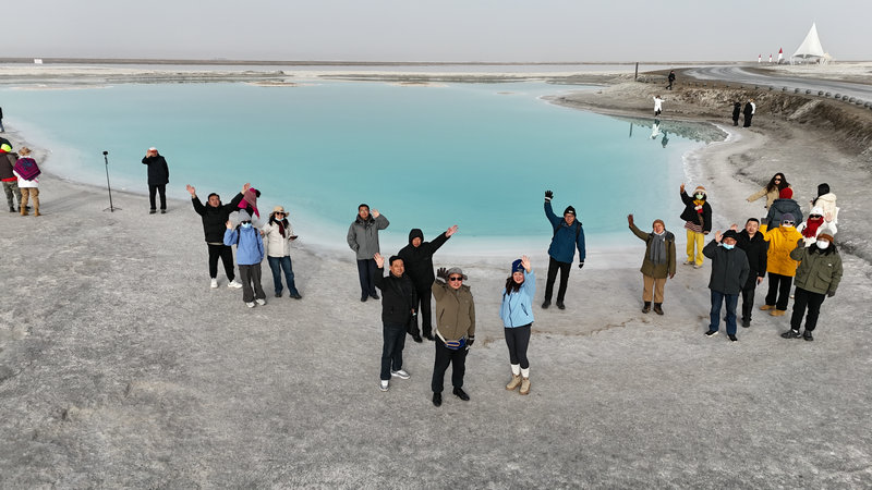 下午抵達被譽(yù)為“天空之鏡”的茶卡鹽湖,湖面如鏡,倒映著(zhù)藍天白云和遠處的雪山,美不勝收。大家穿上高筒鹽湖靴,走進(jìn)湖中,感受著(zhù)鹽湖的神奇魅力,仿佛置身于仙境之中。